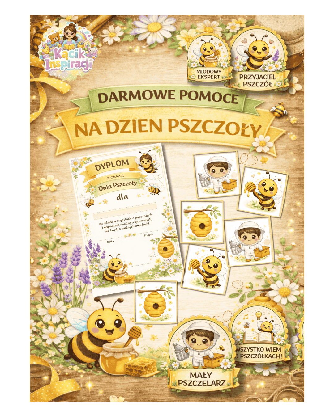 ✨ Co znajdziesz w pakiecie? 💛 Dyplom z okazji Dnia Pszczoły 💛 Odznaki dla dzieci (np. „Miodowy ekspert”, „Przyjaciel pszczół”) 💛 Gra memo – urocze ilustracje do zabawy i nauki