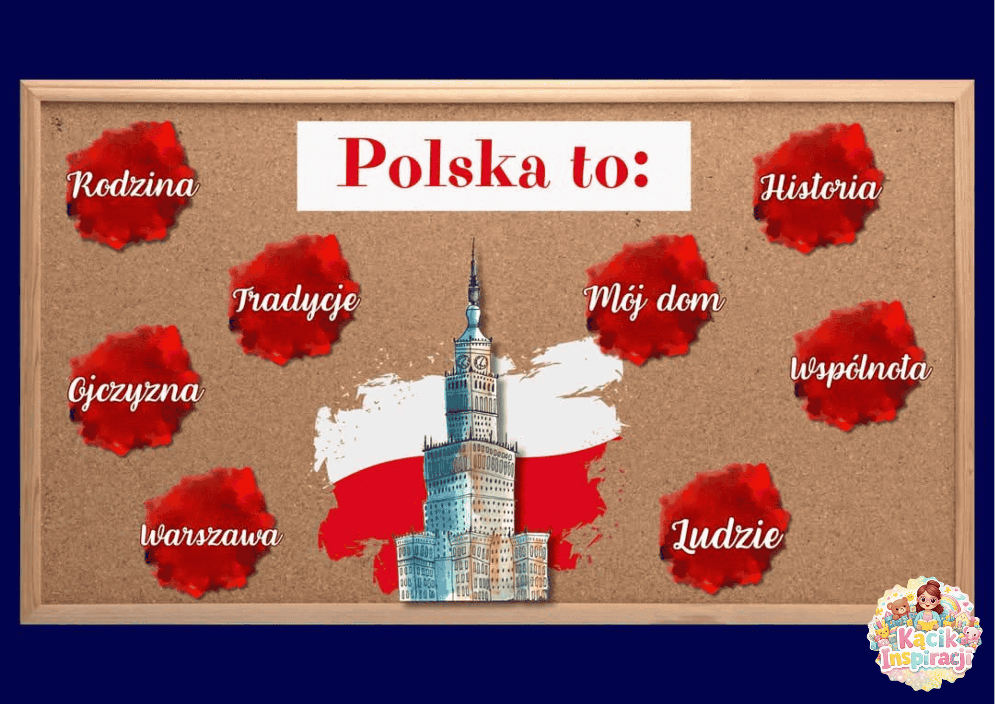 Plik PDF zawiera: 🔴 Napis Polska to:... 🔴 Grafikę pałacu kultury na biało czerwonym tle (składająca się z 7xA4) 🔴 Czerwone plamy z napisami - każdy na stronie A4